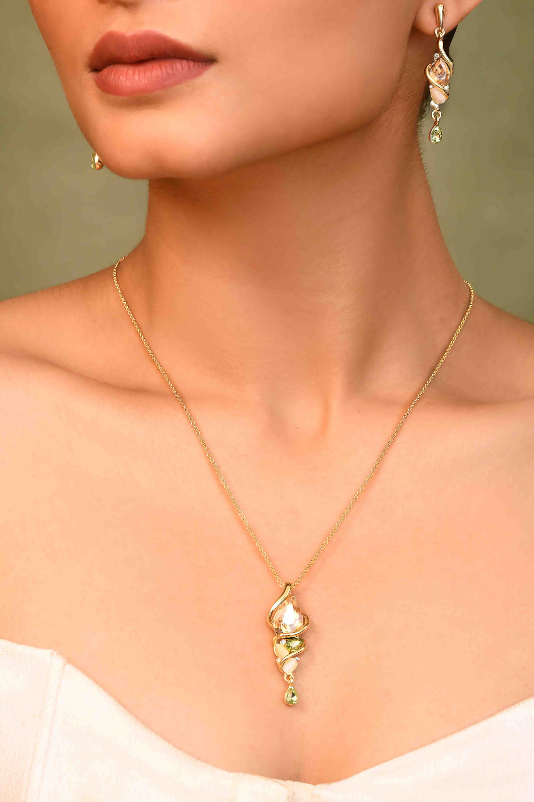 UNIHLC Olive Twist Set -Elegant gold-tone spiral design with dual-toned stones-Features a peachy crystal center...